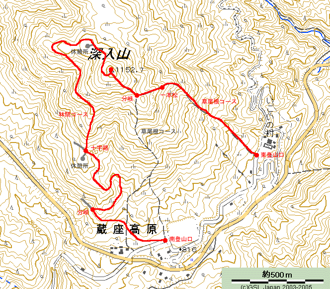 草尾根コース東登山口と南登山口の合流地点、