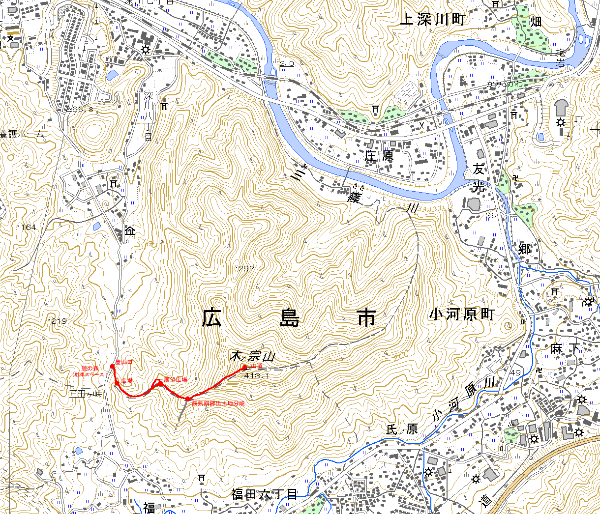 途中、広島東IC方面の展望のある広場を通過し、胴剣、銅鐸出土地分岐まではこんな道が続きます。