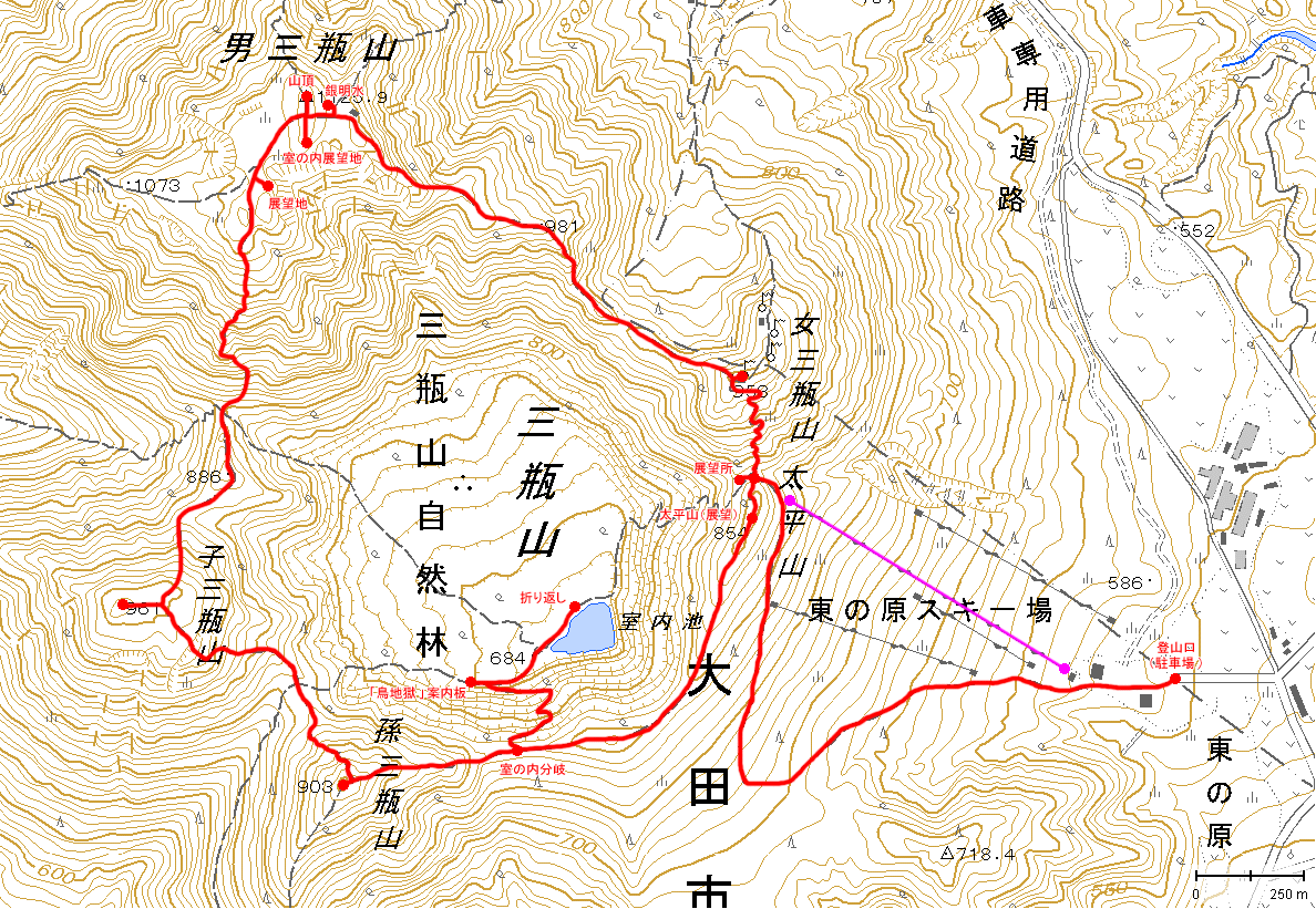 私の条件として、①完全縦走(尾根を完全に1周)、②室の内に下りる、③男三瓶山で昼食、の3点でした。