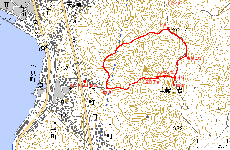 山頂(ピーク)に三角点が無いので、「国土地理院地図」には「烏帽子岩」としかなく、