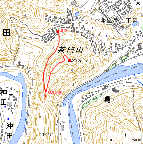 比高100mですので、登山としては少々物足りませんが、川岸からは比高180mある様です。