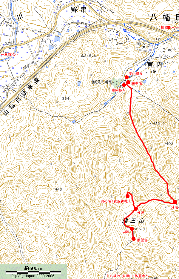 (まとめ・総評) 前日、なかなかお目にかかれないくらいの快晴で空気も澄んでいたのですが、 一夜置くとこんなにも霞んでしまって... 昨日登って置けば、と悔やまれます。(T_T) 谷筋から入山し、しばらくは緩やかな登りが続きます。 尾根が近くなってくると丸太の階段が出現し、急登になります。 尾根道は、急登→ほぼ平坦→急登→ほぼ平坦を繰り返して山頂に至ります。 尾根道の分岐から「奥の院」へは、緩やかな下りです。 鉄塔の展望台は危険(立入禁止)なのでお勧めできませんが、 山頂先の展望所(東屋あり)からは、一応三原市街地方面のみの展望が得られます。 場所は、 三原ICと御調町を結ぶ国道486号線途中(※1)から南に折れてすぐの「やはた川自然公園」が登山口です。 ※1)この近辺で高速道路と交差しているので分かりやすいと思います。(ルート図参照) 案内板B(写真2枚目)には「龍王山→大峰山→仏通寺」への「中国自然歩道」が紹介してあります。 時間と体力があればバスを利用して、このコースも面白いかもしれません。 | |