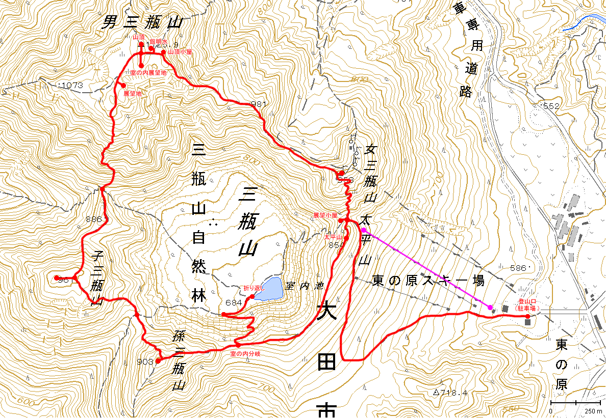 孫三瓶山の登り下り、子三瓶山の登り下り、男三瓶山の登りは超急登超急降ですが、他は比較的楽な工程です。