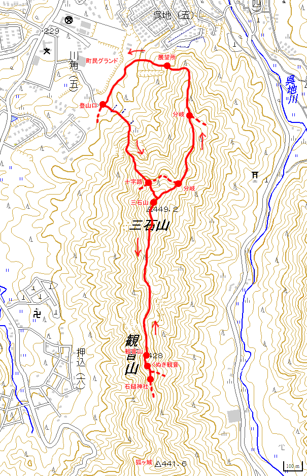 熊野高校横の道を、町民グランド方面に曲がり、「三石山→」の案内板に導かれグランドの門手前を右に、