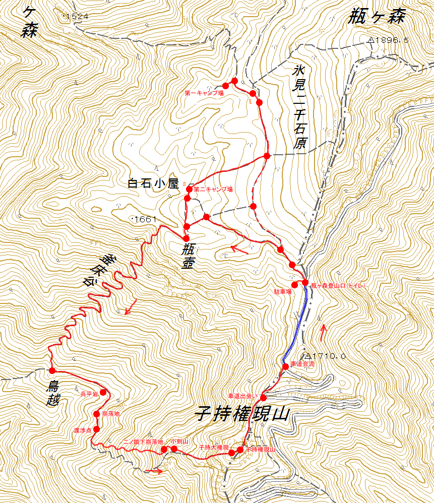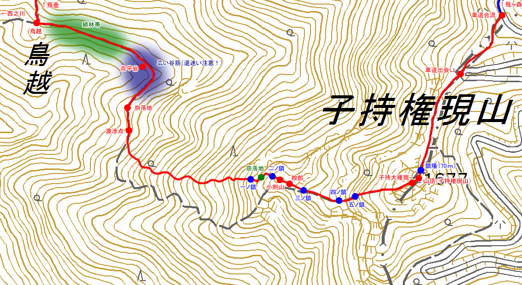 6年前には、西之川から登って、鳥越→ホンガケ道→子持権現山→瓶ヶ森とバテバテで歩いた道を、