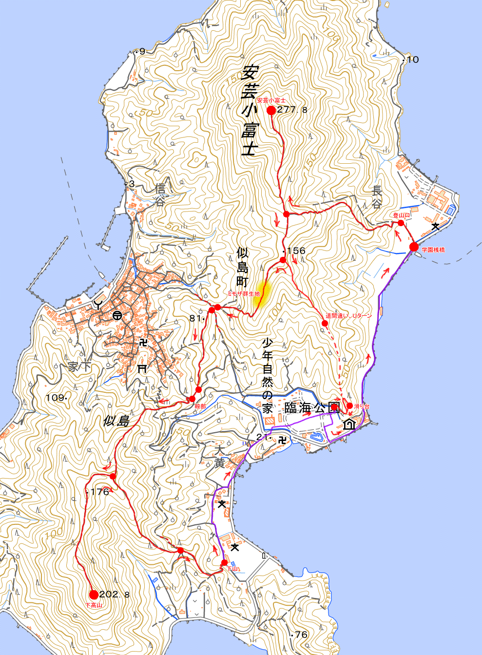 似島臨海少年自然の家方面に採った後、下高山への分岐があると思っていたら、似島港方面に採った後だった。