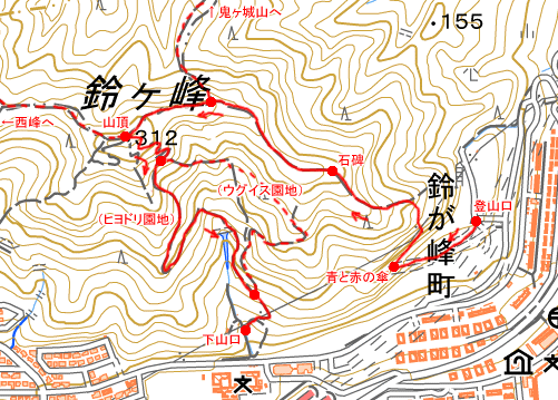 今回は、石碑の方から登り、ヒヨドリ園地を経て、井口台中の前に下山し、700~800m舗装路を歩いて周回する。