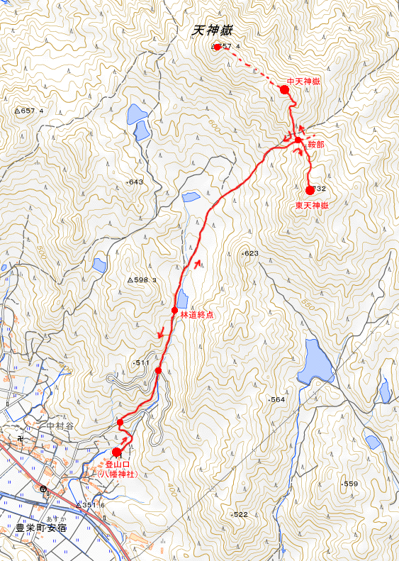 ちなみに、三角点も最高所も西天神だが、現地の案内表示に従えば、中天神を「山頂」と呼んでいる様だ。
