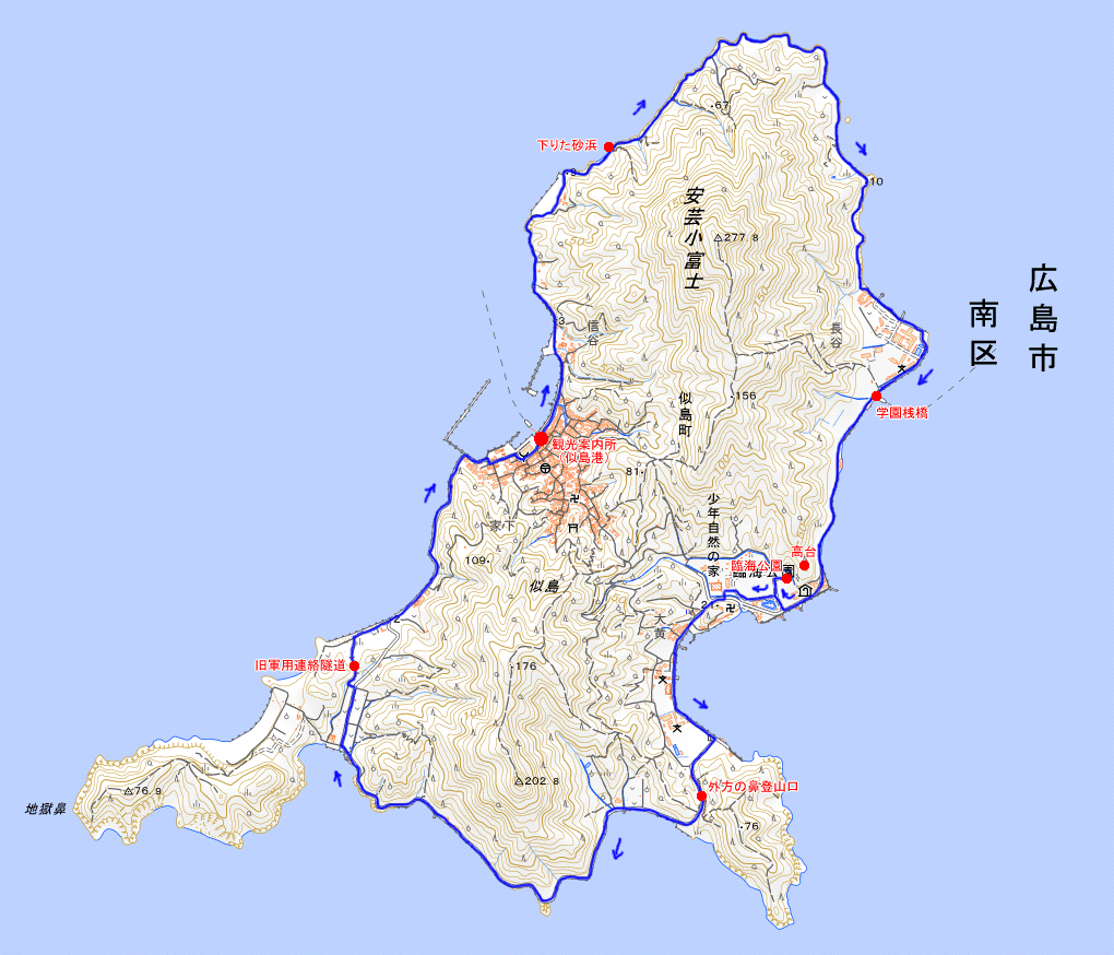 似島学園の辺りで振り返って、市街地方面。