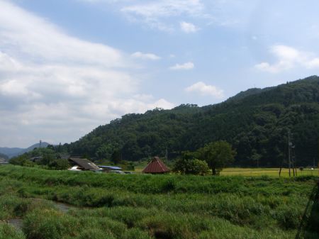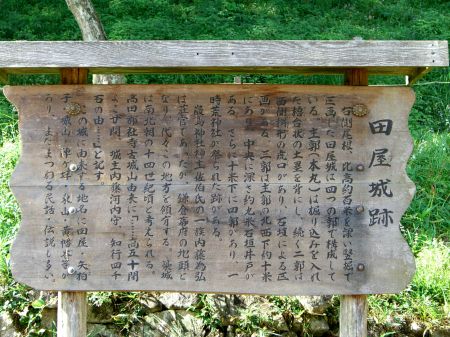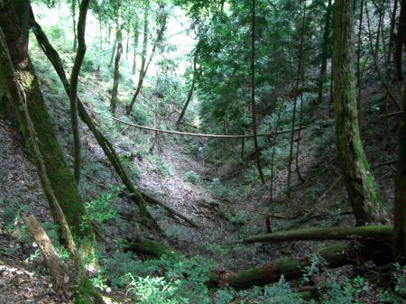 その竪堀を上から... 実はこの先で道が荒れていて断念。 断腸の思いで引き返す。 この後すぐ近所の日下津城跡に行ってみるも、 やはり荒れていて道が分からず早々に断念。 気持ちを切り替え、猿掛城を目指す... おまけ① 竪堀を外から見てみる。 おまけ② 田屋城遠景。 中央の高所が多分本丸。 その右に竪堀が伸びてきて尾根を切断する。