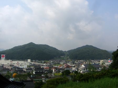 左の山の尾根の先端(中央)が天神山城跡でしょう。