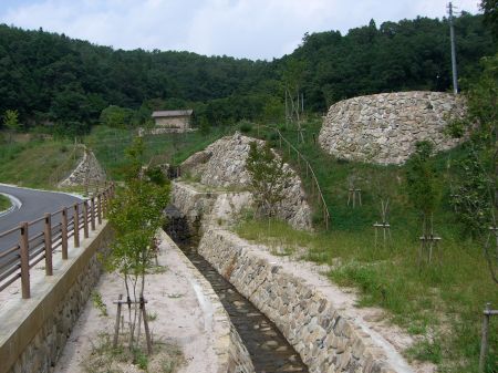 石垣、堀、建物の柱穴が出土したらしいが、