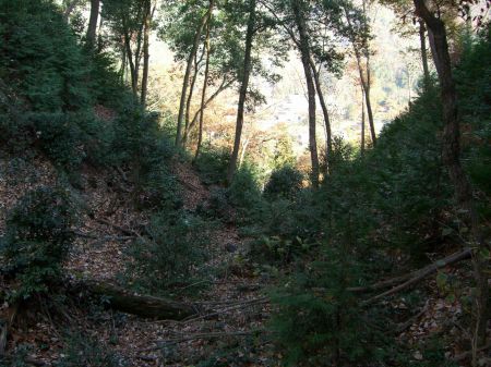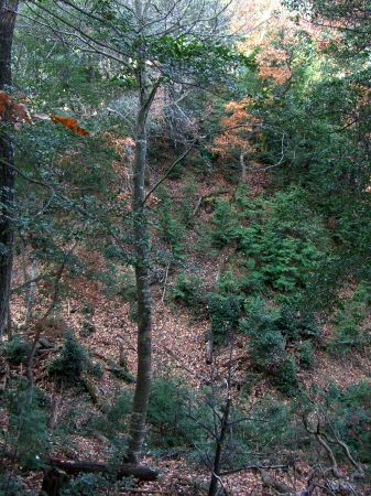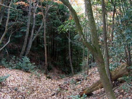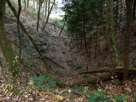 尾根まで伸びる竪堀を麓から見上げる。