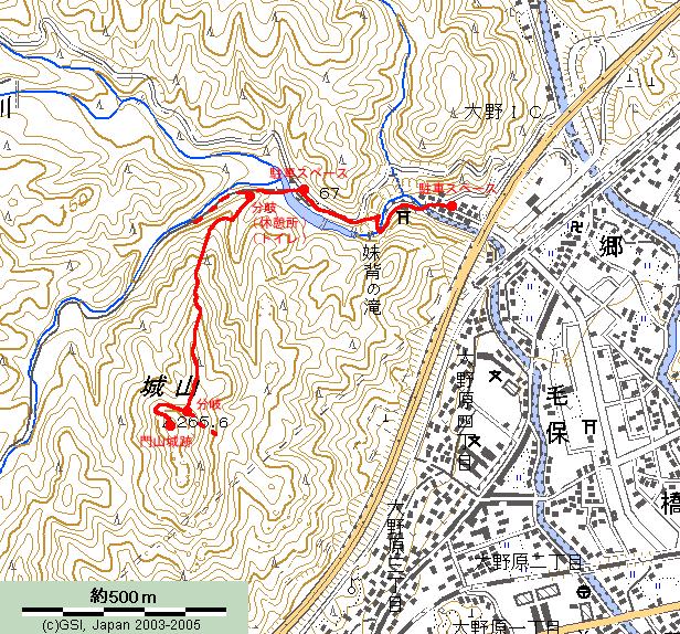 歩いて大頭神社右を通過し、雌滝を右に見て、雄滝手前で右に上がります。