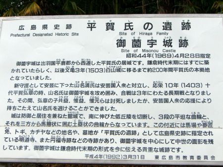 (まとめ・総評) 平賀氏の3代惟長の築城。 15代弘保が白市の白山城を築城して移り、平賀氏の200年間の拠点としての役目を終えた。 城跡の周りを1周しましたが、かなり峻険で外からの攻撃は困難でしょう。 A郭からE郭へも容易に登れず、守りの形としては理想的と言えるでしょう。 西条ICから国道375号線を北へ約2.7km、「中核工業団地」の標識を右折。 JR入野駅方面に向かう幹線道路に入り約2.8km、右に案内表示を見て右折。 100mで左に「平賀氏の墓」、更に400~500mで左に案内表示を見て左折。 すぐ左手奥に写真1枚目の案内板が見えます。 案内板前に数台駐車可能です。 案内板を右に行くと、すぐA郭B郭が左手に見えます。 E郭へは、A郭B郭を見過ごして直進して外側から登るか、本文で説明した方法で登ります。 | |