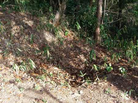 案内板から直進すれば大手道だが、右にとって大倉屋敷跡を目指す。