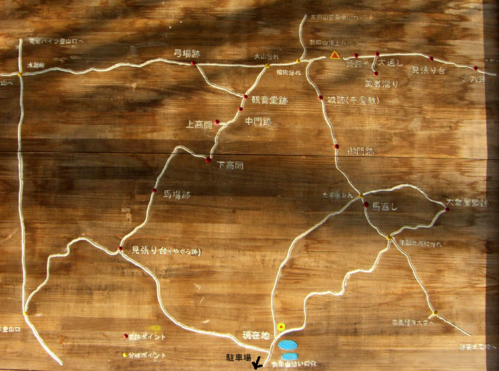 そこから、馬返し→山頂→出丸跡→弓場跡→観音堂跡→見張り台→武田山憩の森の経路をとった。