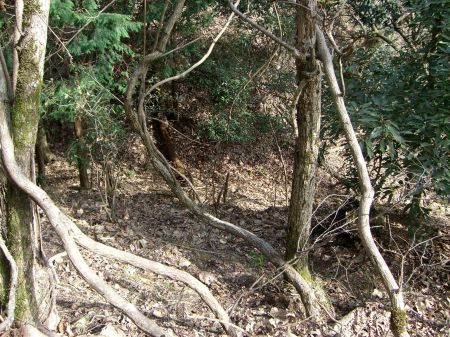 ![]() | 更に道無き急坂を南へ下って行くと、 支尾根の根元が堀切で分断されています。 (堀切の上から) |