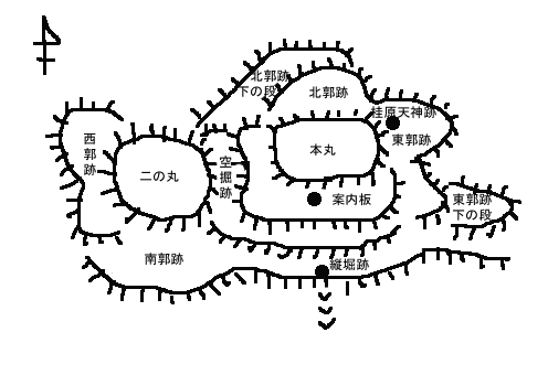 本丸、二の丸を高所に、切り立った崖下の東西南北に郭を配している。