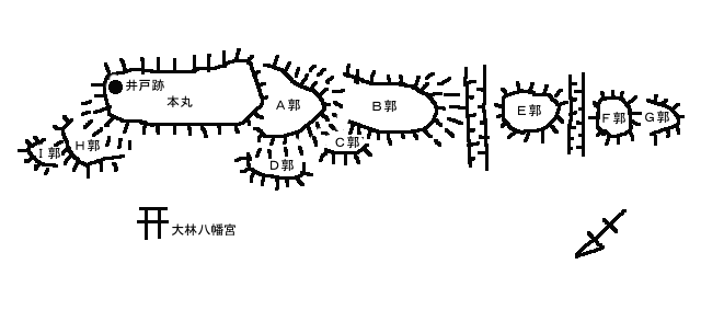 国道54号線大林小入口交差点を東に入り300m、突き当たりを右へ、すぐ大林八幡宮下の城跡案内板の場所に着く。
