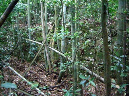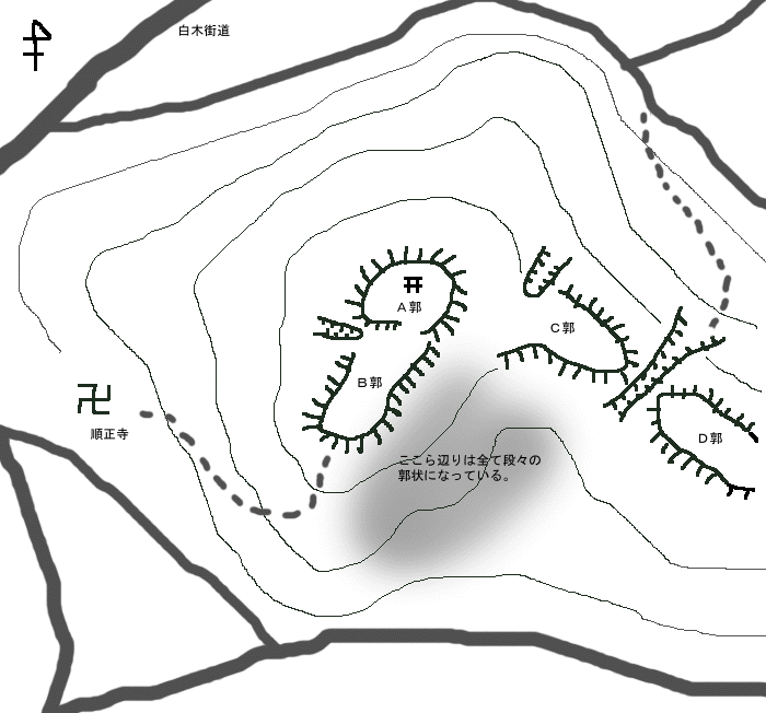 (まとめ・総評) この城に関してはまったく資料がありません。 他にも小さな郭が幾つかある様ですが、確認出来たのは「地形図の表示」の通りです。 城跡の西裾には順正寺があるが、この城に伴う館跡の可能性があります。 県道37号線(白木街道)を深川方面から白木方面に向かえば、途中JRのガード下をくぐります。 そこから300mで右に順正寺で、街道沿いに突出した丘陵地があります。 駐車場は無いので「地形図の表示」の"白木街道"と書いた辺りに、土曜市の開催場所があるので、 そこの隅の方に停めさせてもらいました。 (ちなみに自宅から歩いても10分程度の所です。) 登山口が分からず、辺りをうろうろして、結局南の斜面から取り付き、道の無い所をよじ登ってB郭に出ました。 丘陵地北の登山道から入り、堀切の所に出るのが一番いい方法でしょう。 木が生い茂り、各郭からは展望は一切ありません。 | |