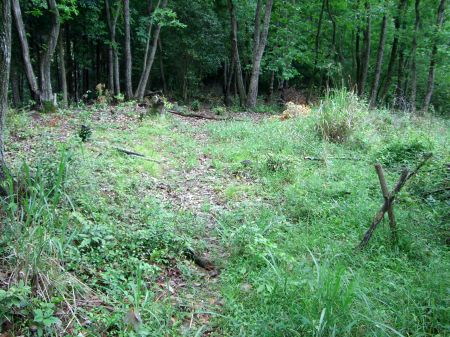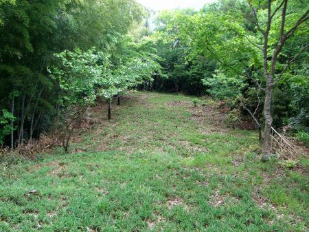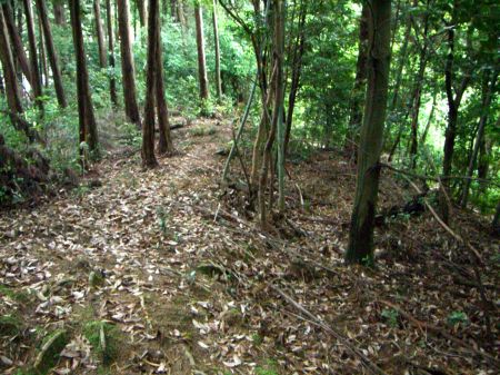 ![]() | その堀切を上から北に向かって見下ろした所。 ここが山道にもなっている。 |