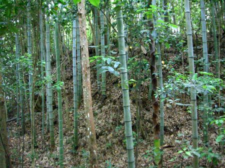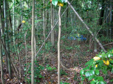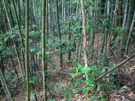 ![]() | 登山道を探したが全く見つからないので、 西側から藪を掻き分け入山し、 急坂を竹の木等を伝って登り、やっと主郭に到着。 郭も藪だらけです。 |