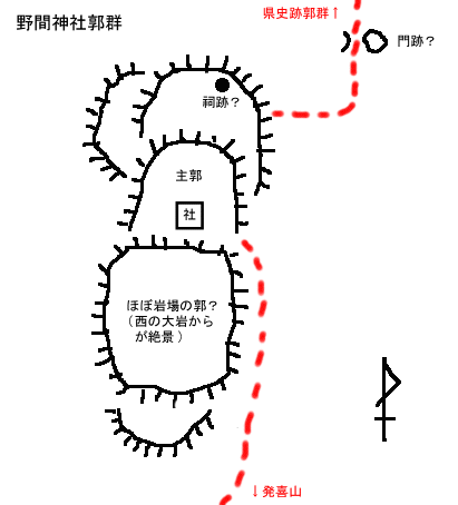 野間神社郭群は割とはっきりしています。神社裏の岩場で、西の大岩が展望が最高ですが、