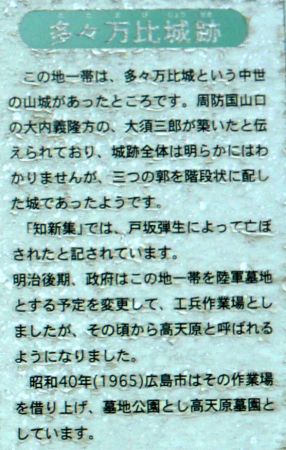 高天原墓園からすぐ下が多々万比城跡だが、藪で城跡への下り口が見つからず、