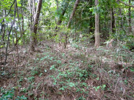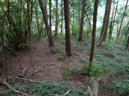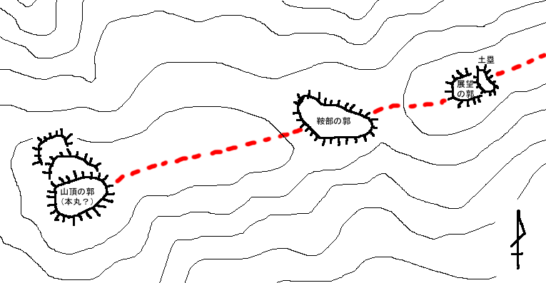 山頂の郭と鞍部の郭の間とか、土塁の東側にもいくつか郭が存在するみたいですが、