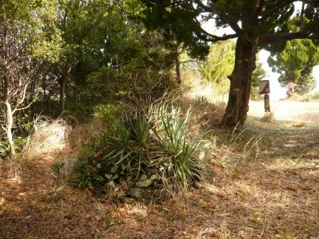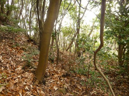 ![]() | その下にある出丸。 この先の尾根に堀切でもあるかと思いましたが、 みかん畑で何もありませんでした。 |