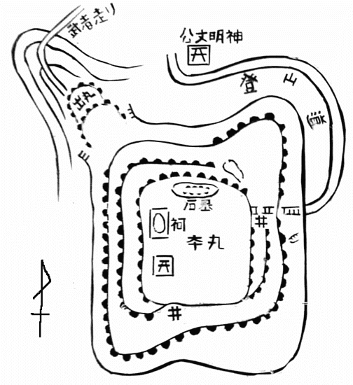 ![]() | 本丸の北西3段下にある広い郭から 本丸方向を見上げる。 |