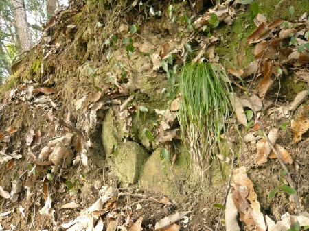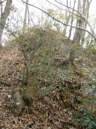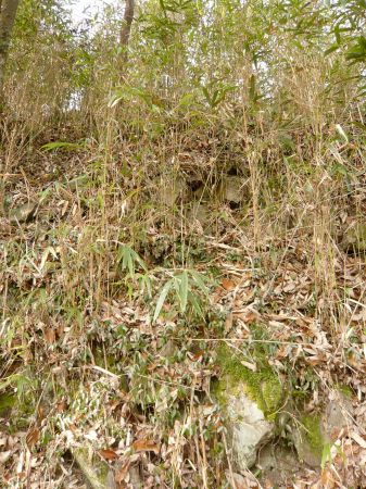![]() | D郭から帯郭を見上げる。 石垣跡が見える。 |