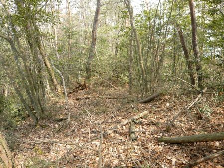 そこから東へ歩いていくと、右手に林道があり、林道→尾根東側の谷筋→尾根とアプローチ。