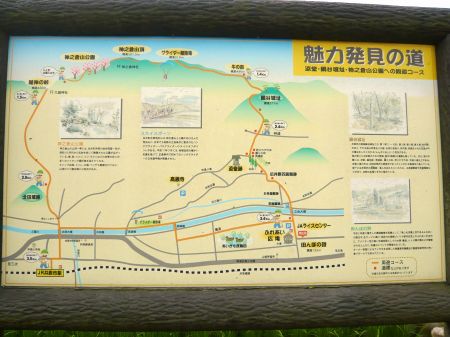 城跡北西三篠川対岸にある「魅力発見の道」案内板。
