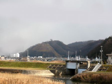高屋川を挟んで中央は、要害山城(天神山城)跡。