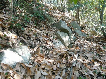 A郭南斜面の藪に分け入り、石垣跡。