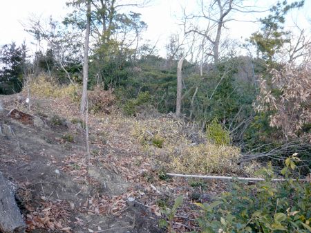 ![]() | その2本の堀切です。 現在は山道の為、畝って見えるだけです。 突き当たりが土塁状になっており、 その左奥が主郭(A郭)です。 |