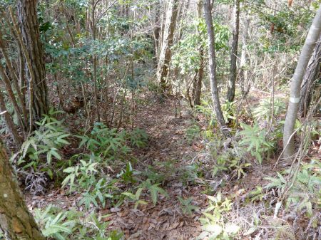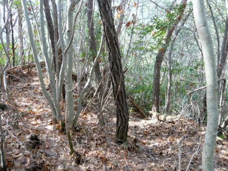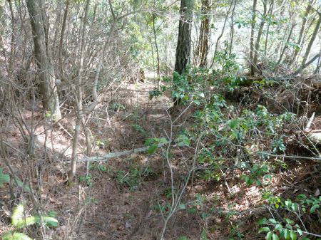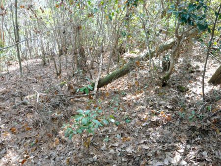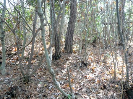 ![]() | 主郭から150m南西の郭跡。 郭図が無ければ郭跡だとは分かりません。 郭図だとこの北東の鞍部に堀切があるはずですが、 何も確認出来ませんでした。 この堀切がここの楽しみだったのですが... |
