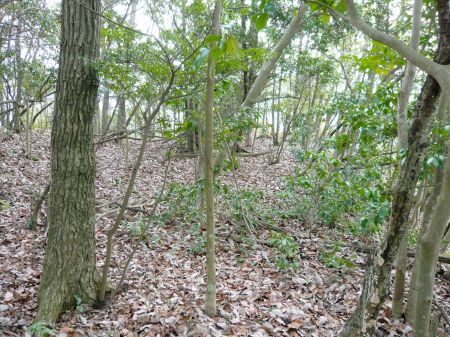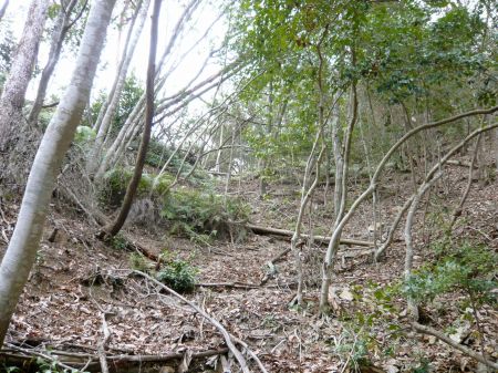 ![]() | A郭にある虎口。 ほとんど道の体をなしていないが、 ここから北の堀切に向けて下りてみる。 |