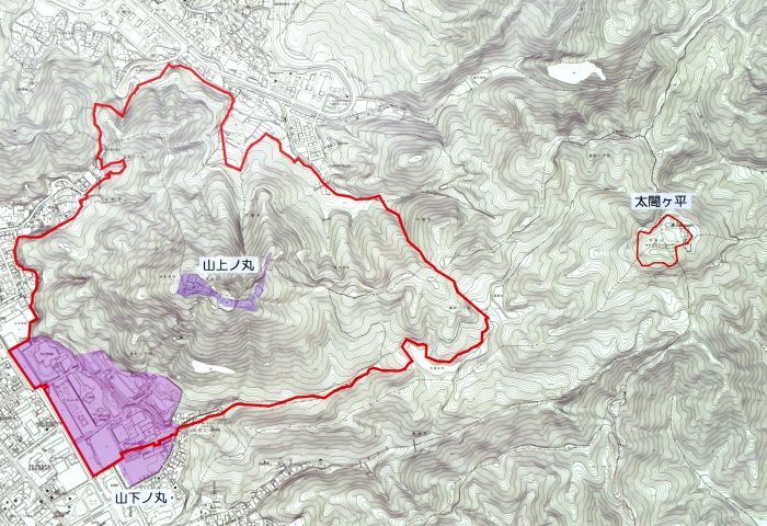 山頂近辺の本丸、二ノ丸、三ノ丸などからなる山上ノ丸遺構群は、中世から近世にまたがる城郭跡です。