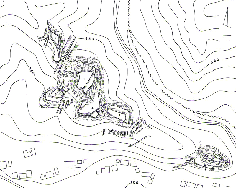 城跡は、標高280mの丘陵頂部の主郭を中心に北西伸びる尾根筋、南東に伸びる丘陵上に七つの郭と