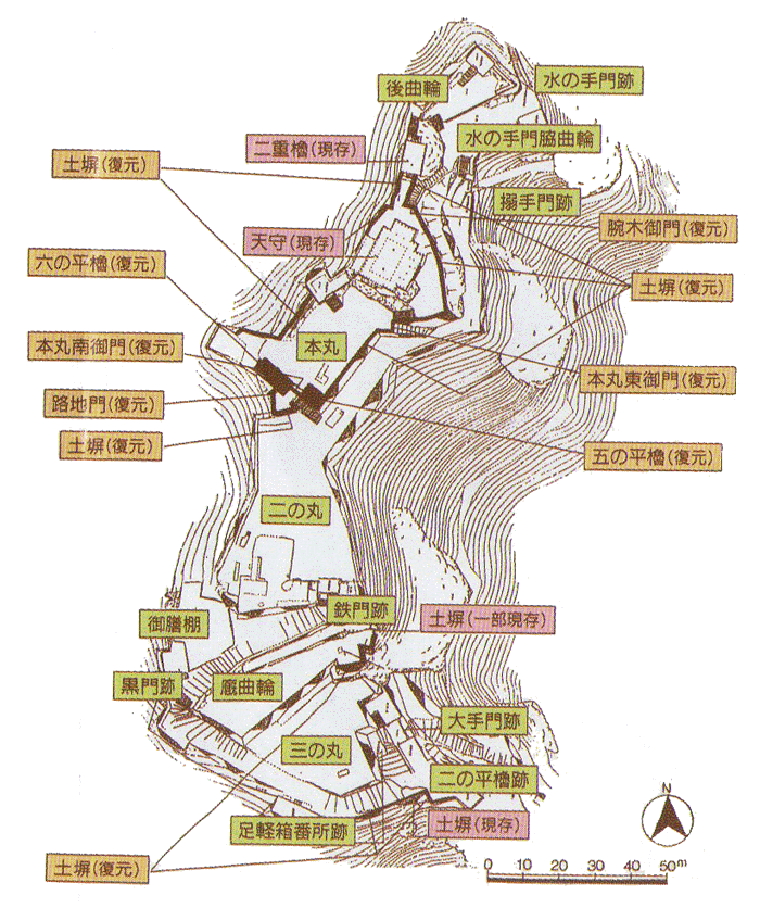 天守、二重櫓、土塀など、現存する近世の遺構が残る。