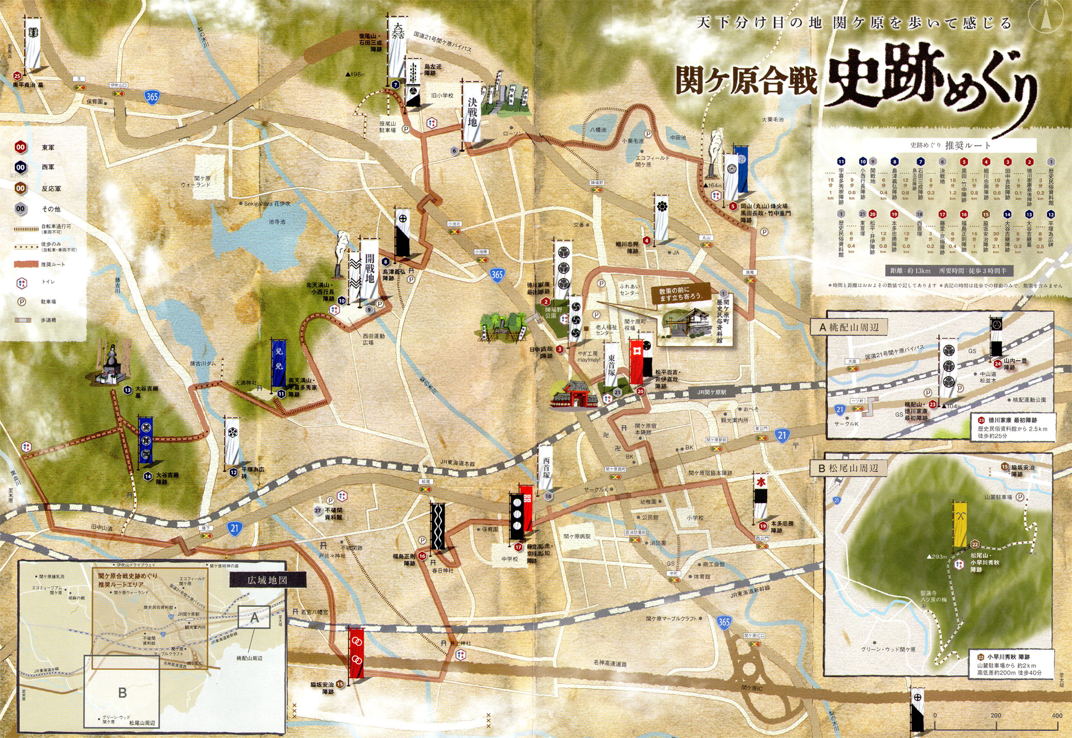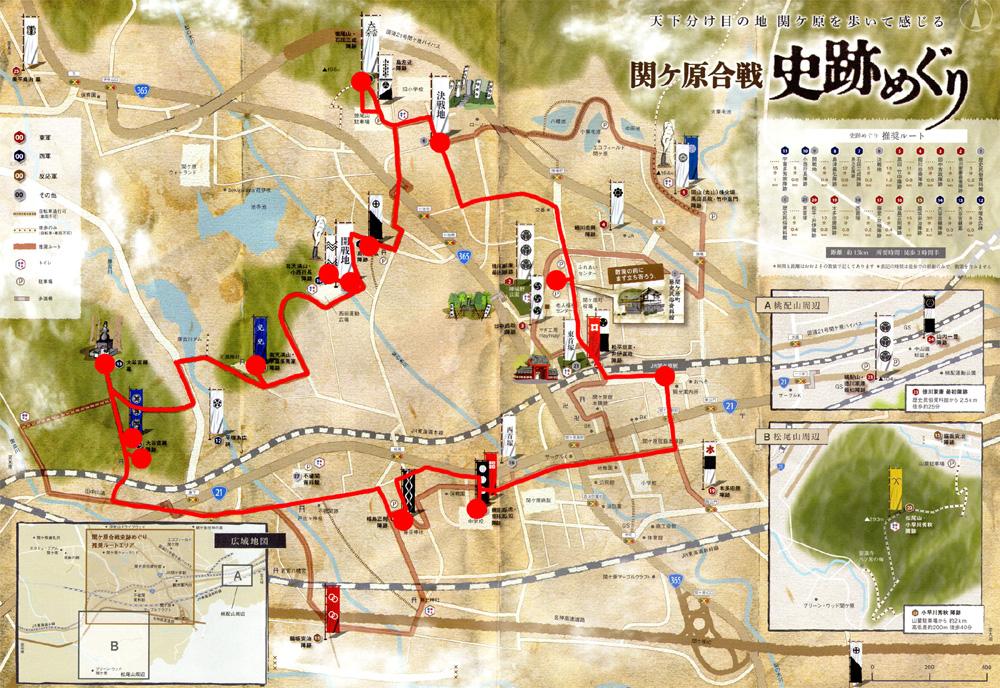 決戦地 → 石田三成 陣跡/島左近 陣跡 → 島津義弘 陣跡 → 開戦地 → 小西行長 陣跡 → 宇喜多秀家 陣跡