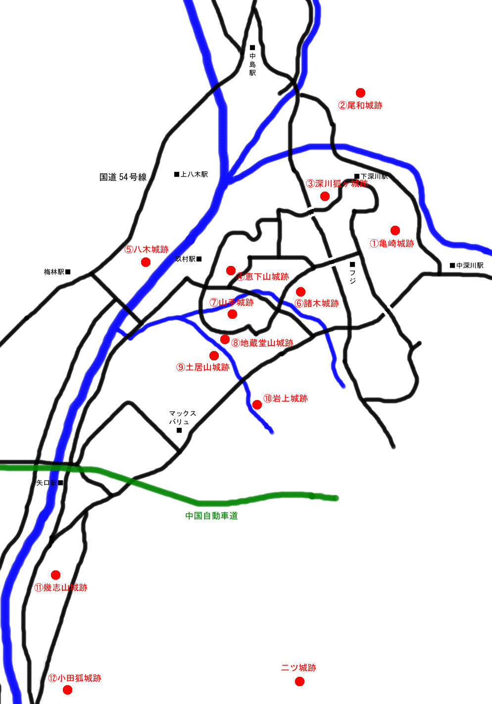 城跡は全て「ひろしま昔探検ネット」の地図を参考に、周辺からの目視で確認しただけですが、